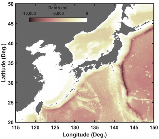 The calculation domain of the wave model built based on WW3 was from 20° to 50° in latitude and from 115° to 150° in longitude (Figure 1). The ETOPO1 of the National Geophysical Data Center (NGDC) was used as the ocean depth grid and coastline data from the Global Self-consistent Hierarchical High-resolution Shoreline (GSHHS) were used.