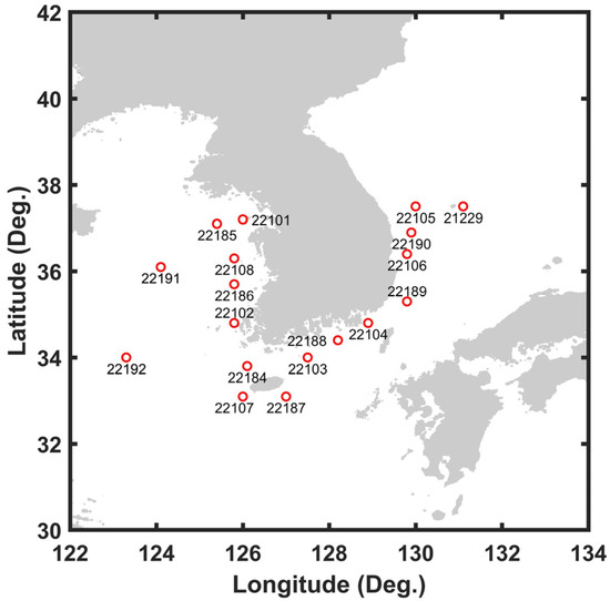 Figure 2 shows the installation locations and ID numbers of the meteorological buoys. The data observed by 18 marine meteorological buoys of KMA at 30 min intervals were used to verify the forecasting performance and sensitivity numerical simulations of the wave model in this study. The observation data to validate the wave model only comprised data that went through quality control rather than raw data. Missing data and abnormal observations were also excluded. The observation data after quality control were assumed to be true values for validating the wave model’s forecast results. Furthermore, since most of the buoy data are observed at a height of less than 5 m, it is considered that they include a prediction error according to the observation height when compared to the wind field of 10 m height used in the wave model.