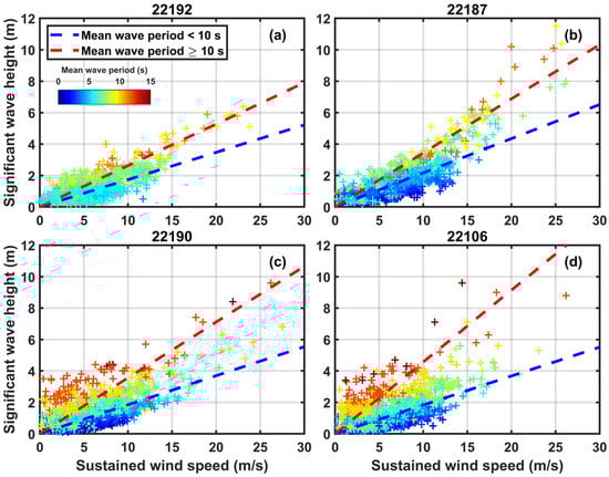 Comparison between the observed wind speeds and the wave heights at (a) 22192; (b) 22187; (c) 22190; and (d) 22106.