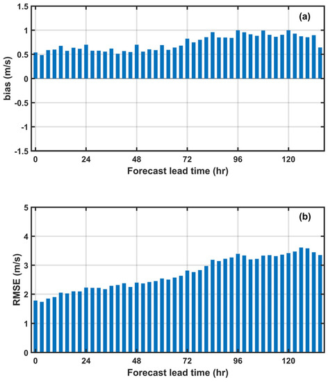 Validation result of (a) bias and (b) RMSE as a function of lead time for suspended wind speed.