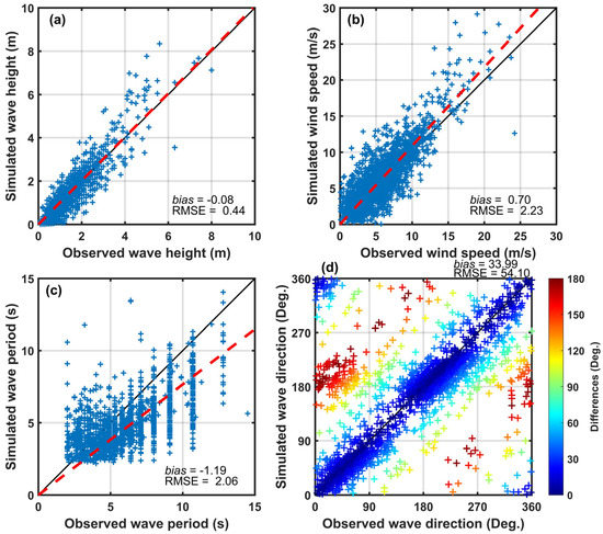Figure 6 shows the observation results at all buoy positions and the wave model’s forecasting results for +24 h. The distribution of significant wave heights is concentrated under 3 m (Figure 6a) and waves appear to develop due to offshore winds of approximately 15 m/s or less (Figure 6b). In terms of the wave period in Figure 6c, most seem to be wind waves of less than 10 s and, as the wave period increases, the model’s tendency to underestimate grows. In particular, the model’s forecasting performance for swell components of 10 s or more was lower than its forecasting performance for wind waves of 10 s or less. In terms of wave direction, the measurements were distributed in the baseline of the observation and model, and the error range was approximately 54° (Figure 6d). The overall forecasting accuracy was high from the input data (offshore wind forecast data). The error analysis results for the significant wave height, wave period, and wave direction predicted by the wave model and the wave model contributed to relatively precise numerical simulations for the correlation between offshore wind and significant wave height. These were the results of analyzing the observation data above.