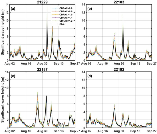 Figure 7 compares the significant wave height time series at +24 h according to CDFAC changes at four buoy points. According to the results of the entire significant wave height time series, the larger the CDFAC, the larger the predicted significant wave height, and the smaller the CDFAC, the smaller the predicted significant wave height. Overall, the time series predicted by the model and the observed time series showed similar trends. However, the significant wave height difference according to CDFAC changes was generally more noticeable when the significant wave height reached its peak value. There was no significant difference when the significant wave height was small.