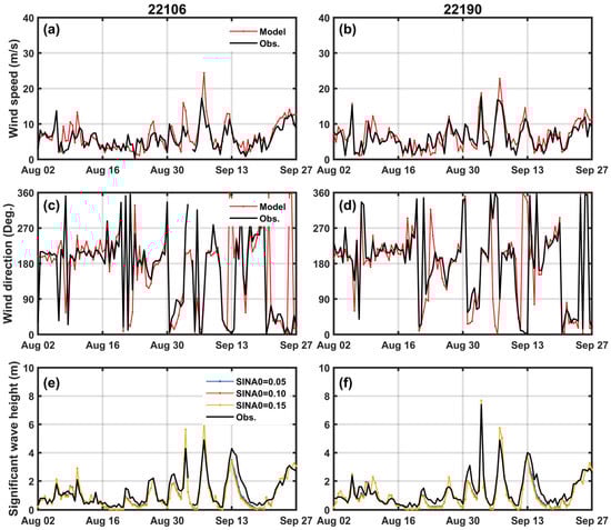 Figure 8 shows the significant wave height time series according to SINA0 (CDFAC = 1.0) at 22106 and 22190 buoy points. Although SINA0 is a model variable closely related to the direction of the input offshore wind, it was difficult to grasp the effect on the significant wave height forecasting results in the range of SINA0 used in this study. However, in the time series data around 12 September, when the significant wave height was not relatively high and gradually decreased from its peak value, the significant wave height tended to increase when the SINA0 became smaller. When determining the directional distribution in Equation (4), SINA0 is a variable multiplied by adverse winds. Therefore, as the value decreases, the effect of adverse winds becomes relatively small and, as a result, the effect of favorable winds increases. Even if the wind speed is not high, SINA0 can affect the forecasting results in sections where the wind direction changes rapidly by about 180°. However, as it is difficult to grasp the influence of SINA0 on the forecasting results with only the results of this study, we intend to investigate the impact on physical variables in more detail through follow-up studies.