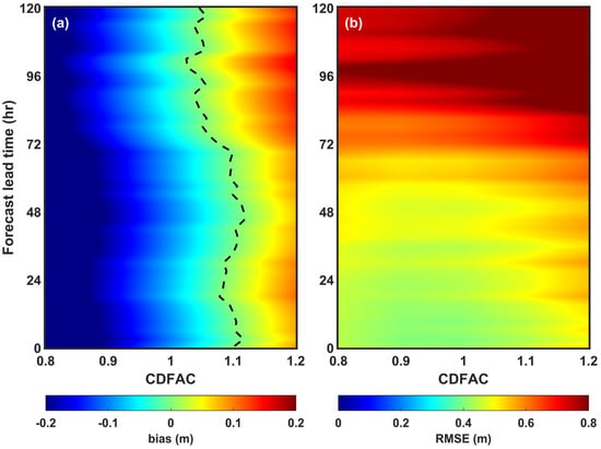 (a) Bias with equilibrium line (black dot line) and (b) RMSE distributions corresponding to CDFAC changes.