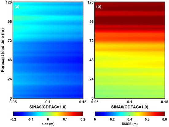 Figure 9 shows the bias and RMSE by forecast time according to CDFAC changes at all observation buoy positions. First, a positive bias was confirmed as the CDFAC increased, and the model’s tendency to overestimate increased (Figure 9a). According to the RMSE by forecast time in Figure 9b, the minimum RMSE was generally shown when the CDFAC range was between 0.8 and 1.1, up to 72 h of the forecast time, and RMSE tended to increase when the CDFAC increased as the forecast time became longer. Figure 10 shows the verification results by forecast time according to SINA0 changes when CDFAC is 1.0. As described above, the bias and RMSE results showed slight differences in only a few sections and did not have a significant effect on the forecasting results in the SINA0 sensitivity test range.