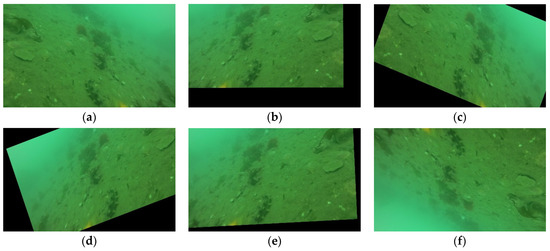 Image offline data augmentation: (a) Original image; (b) Translate + horizontal flip; (c) Translate + rotate; (d) Horizontal flip + rotate + translate; (e) Rotate (f) Vertical flip.