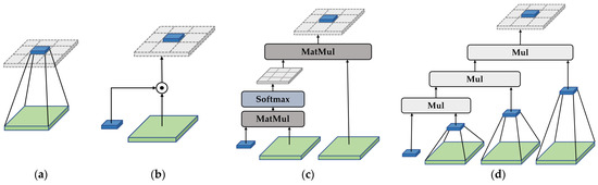 In this paper, spatial modeling operations that are representative and perform different interaction sequences are compared, as shown in Figure 6, where the blue structure is a feature and the gray structure is the feature’s adjacent region. Each spatial model individually shows the spatial interactions between the feature and the neighboring regions. (a) Standard convolutional operations do not explicitly consider spatial interactions. (b) Dynamic convolution introduces the SE module, which makes the weights dynamic and improves the modeling ability of convolution by adding channel interactions [26,27,28]. (c) The self-attentive operation performs second-order spatial interactions through two consecutive matrix multiplications [29]. (d) The uses gated convolution and a recursive design to implement arbitrary-order spatial interactions [25].