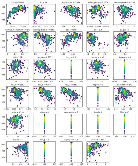 The main genetic operator for hyperparametric evolution uses crossover and mutation. During the training process, it is the offspring created with 80% probability and 0.04 variance based on the best combination of parents from all previous generations. The results are saved separately for each time and for the highest fitness. Each hyperparameter is visualized in the evolutionary process, as shown in Figure 7. Each figure corresponds to a hyperparameter, where the x-axis represents the value of the hyperparameter and the y-axis represents fitness. The concentration of data points gradually decreases as the color changes from yellow to gray. The yellow color indicates a higher concentration of data points, while the vertical line indicates that a parameter has been fixed and will no longer be subject to further mutation.