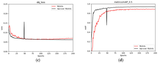 All models are not loaded with pre-training weights during the training process. As the hyperparameter evolution based on the genetic algorithm is adopted, the default hyperparameters are no longer used in model training. The initial learning rate is 0.00886. At this learning rate, the model converges faster. As mAP continues to increase and the loss continues to decrease, the model reaches its optimal state finally. The weight decay coefficient is 0.0004, and the momentum factor is 0.85395. In the training, the batch size is 32, the optimizer uses Adam optimizer [34] and epochs are 200. The image sizes in the input network are resized to the default size of 640 × 640 pixels. The loss variation curves and mAP variation curves of the improved YOLOv5s model and the original YOLOv5s model are shown in Figure 8.