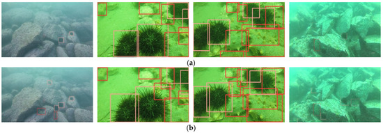 According to the data in Table 5, after adding the HorBlock module, the mAP of the improved YOLOv5s increases by 0.9% compared with the original YOLOv5s, which indicates that the network pays more attention to sea cucumbers and sea urchins and reduces the influence of useless features. While using the hyperparameter evolution, the mAP increases by 1.1%, which indicates that the adjustment of hyperparameters can help the network obtain a better result in the training process. The mAP increases by 2.5% with offline data augmentation, which indicates that the original samples are relatively not rich enough. The use of data augmentation can greatly enrich the samples and improve the generalization ability of the model. The final detection accuracy of the model increases by 4.5% compared with the original YOLOv5s. Therefore, the model is able to meet the experimental requirements in terms of the detection accuracy. The experimental result also shows that parameters in the improved YOLOv5s increases by 4.18 M compared with them in the original YOLOv5s and increases by 4.09 ms considering the average detection time. The comparison effect of the original model and the improved model is shown in Figure 9.