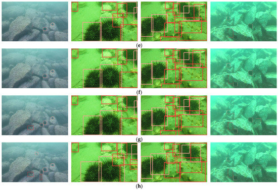 To further validate the performance of the improved YOLOv5s model, a comparison experiment is conducted with RetinaNet, SSD, YOLOv4, YOLOv5m, YOLOV5l and YOLOv5x. In the experiment, all other models use default parameters and all models are not loaded with pre-training weights during the training process. The ratio of the training set, validation set and test set for all models during training is 7:2:1. The experimental results are shown in Table 6. where the mAP of the improved YOLOv5s is 11.75%, 10.31%, 8.08%, 3.2%, 3.1% and 3% higher than that of RetinaNet, SSD, YOLOv4, YOLOv5m, YOLOV5l and YOLOV5x, respectively. The parameters of the improved YOLOv5s are 4.18 M larger than those of the original YOLOv5s, but smaller than those of the other models. The improved YOLOv5s has an average detection time that is 6.29 ms slower than that of SSD, but it is 93.84 ms, 6.46 ms, 6.63 ms, 6.18 ms and 2.63 ms faster than those of RetinaNet, YOLOv4, YOLOv5m, YOLOv5l and YOLOv5x, respectively. The AP of sea cucumber and sea urchin detected using the improved YOLOv5s are both better than those detected with the other models. The detection effect of the models is shown in Figure 10. The improved YOLOv5s, in terms of both missed and false detections, significantly improved, and the regression accuracy is improved compared to the other models.