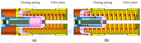 The failsafe closing mechanism in the all-electric subsea gate valve actuator exists to prevent safety accidents caused by system failures. In the various designs of the failsafe closing mechanism for the subsea gate valve actuator, the closing spring is the most reliable and widely used [37,38]. Therefore, we adopted a closing spring as the protection measure for the failsafe closing mechanism of the prototype. The closing spring, in both a state of compression and release, is shown in Figure 2a and b, respectively.