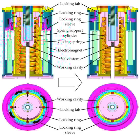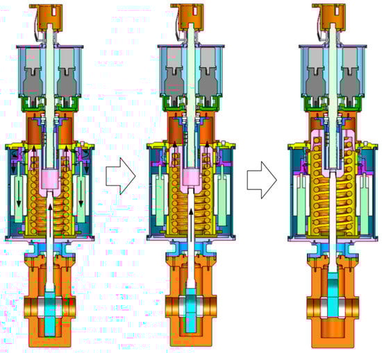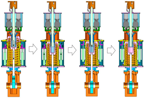 The locking and holding process of the low-power holding mechanism is shown in Figure 6. The drive mechanism compresses the closing spring until the valve is fully opened, and the low-power electromagnet is used as the power source to restrict the position of the closing spring through spiral transmission and cam transmission to ensure that the valve remains open with the minimum power consumption. When the valve fail-close occurs, the electromagnet is de-energized; thus, the closing spring is released to push the valve stem upward rapidly until the valve is fully closed.
