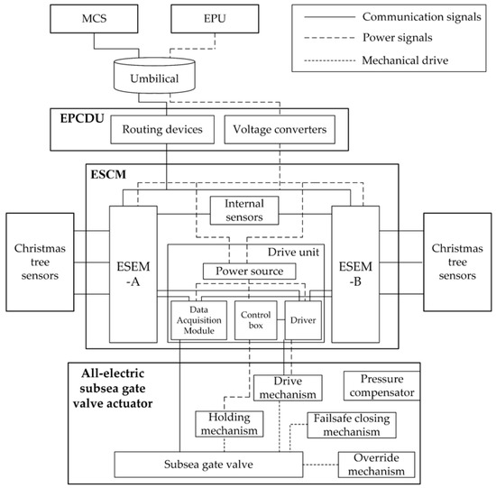 The working principle of the all-electric subsea gate valve actuator is shown in Figure 10. The master control station (MCS) and electrical power unit (EPU) transmit the communication signals and the power signals to the electrical power and communication distribution unit (EPCDU) through the umbilical. The EPCDU transmits the communication signals to the electric subsea electronic module (ESEM) inside the electric subsea control module (ESCM) through internal routing devices and transforms the transmitted high-voltage electrical signals into the low-voltage electrical signals required by the subsea equipment through internal voltage converters to the ESEM and the drive unit inside the ESCM.