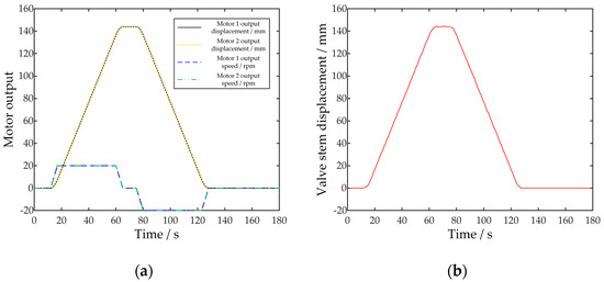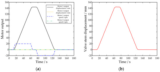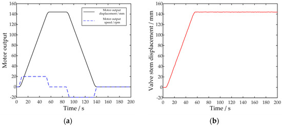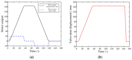 Single-motor driving test results: (a) the motor output curve; (b) the displacement curve of the valve stem.