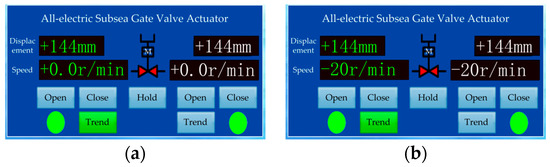 As shown in Figure 19 and Figure 20, when the power supply of a certain motor was cut off, the status indicator light of this motor was always off and its displacement and speed signals did not change. The normal motor could still operate normally and was able to open and close the subsea gate valve independently, and its output displacement and speed change still satisfied the driving requirements of the subsea gate valve.