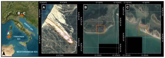 For our specific analysis, two cases were selected along the barrier island system of MGL, as indicated in Figure 1: a washover fan created by a storm event in 2013 on the Martignano barrier island (Box B) and a prograding spit at the western end of the Tratauri bank (Box C). To date, this is the only frequented nesting site of the Little Tern (Sternula albifrons) along the coastline.