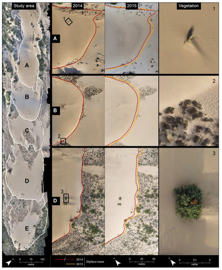 The main parabolic dune of Piscinas. On the left is the UAV orthophoto of 2014, with the representation of the five lobes ((A–E), white lines). In the middle, a comparison of the three monitored lobes (surveys of 2014 and 2015) with the representation of the migration that occurred after 6 months. Zoom boxes on the right allow to appreciate the different types of vegetation identified (box 1: Marram grass; box 2: bushes; box 3: arboreal shrubs). See the text for major details.