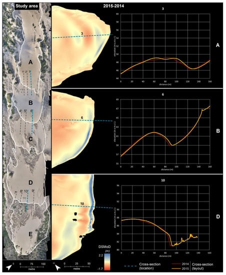 In Piscinas, the first survey, conducted in November 2014, before the beginning of the winter season, covered the entire area of the parabolic dune, while the second, conducted in May 2015, in the middle of the spring season and theoretically after the strong winds period, focused on monitoring the migrating lobes. Unfortunately, during the survey days, strong Mistral winds blew, and only some lobes were acquired. The photogrammetric models were loaded and analysed in ESRI ArcGIS v.10.8. DSMsoD (Digital Surface Models of Difference) were created utilizing the DSMs of the two surveys to assess the erosional and depositional effects of the aeolian transport. To estimate sand displacements, 10 profiles were extracted from the DSMs of the three compared lobes.