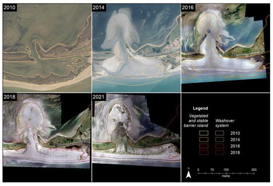 Evolution of the Martignano washover between 2010 and 2021. In each orthophoto, the edges of vegetated and stable barrier island, as well as the washover system, has been mapped for the current year, and overlapped with the previous one.