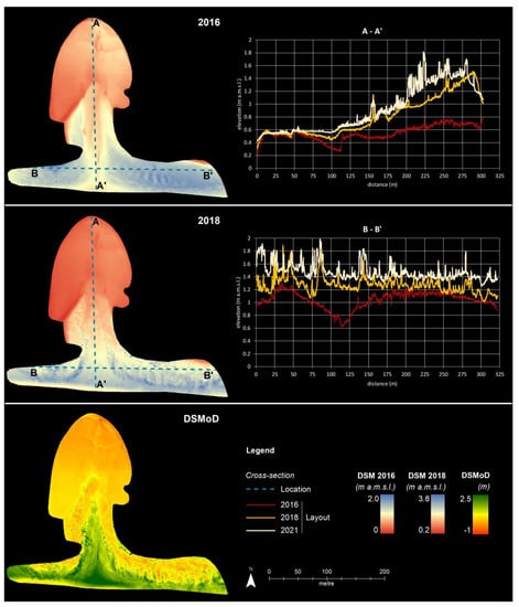Topographical changes of the Martignano washover. On the left column, the DSM of 2016 and 2018, and the DSMoD relative to the comparison between the two years. On the right column, the cross-extracted sections A-A′ and B-B′, reporting the changing elevation of the complete dataset, including the 2021 survey.