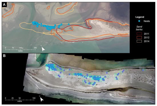 (A) Morphological evolution and spit migration of the Tratauri bank from 2011–2014 (basemap = 2011 orthophoto); (B) Orthophoto derived from drone survey carried out in 2014 along the western tip of the bank occupied by the nests of Little Terns (Sternula albifrons).