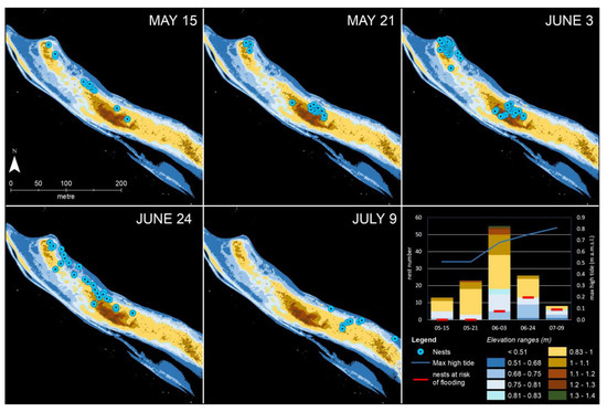 The five censuses conducted on the site allowed for the observation of several nesting phases: the first on 14 May and the last on 9 July 2014. The number and spatial distribution of nests have changed over time. The number of nests reached a maximum on June 3 with 55 nests and then decayed rapidly. Spatially, the colony was mainly located on the landward side of the spit, ultimately being moved eastward (Figure 7). Despite the fact that the temporal evolution of the nests’ number could be considered natural (with an increase, a maximum, and a decrease phase), a very low reproductive success has been observed during the census. Analysing the microtopography on the 0.10-m-classified DSM, we can put the position of the nests in relation to the micro-relief. The choice of the nest sites appears not to be completely influenced by the elevation above m.s.l. (Figure 7). Most of the nests are located on elevations that are not directly affected by high water levels during the time considered; many nests are found on the landward side of the bank, which appears to be the lowest and thus most vulnerable to high tides but is better protected from waves. By classifying the nests according to the different tidal maximum levels for each time interval between one avifauna census and the next, we can finally assess which positions may have been at risk of flooding (see the histogram in Figure 7).