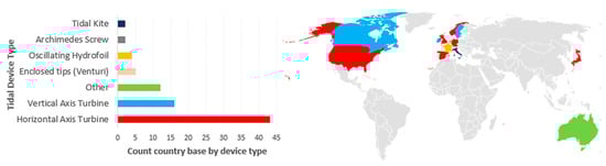 Country-based tidal device types in 2020. Own elaboration using EMEC data source: http://www.emec.org.uk/marine-energy/tidal-developers/, accessed on 10 February 2023.