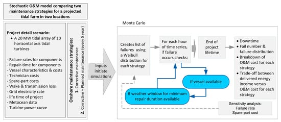 By using the Monte Carlo method [28], a stochastic O&M model was developed to compare two maintenance strategies for a projected tidal farm consisting of 10 × 2 MW turbines at two sites in the northeast Atlantic: France and the UK. In the Monte Carlo simulation, stochastic calculations account for weather windows, vessel availability [18,21], and time between failures [29]. An overview of the model and the processing logic is summarised in Figure 2 and explained further below.