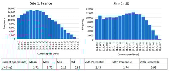 The time-series metocean data of the two locations in the northeast Atlantic Ocean: Site1 in France and Site2 in the Fall of Warness were obtained from industry. Twenty-five-year hourly metocean data for these two sites has been used for the project life-time of an array of 20 MW (10 tidal turbines of 2 MW each) in the model. The characteristics of the tidal device are explained in the next sub-section. The statistics of the current speed and the weather window data for the two sites are briefly explained below. Histograms and statistics of measured current velocities at a water depth of 35 m below the surface for Site1 (France) and 42 m for Site2 (UK) over 25 years are shown in Figure 3.