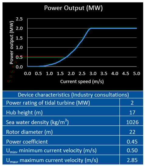 where, Pt is the power generated at hour t, ut is the current velocity (adjusted at the hub height) in m/s at hour t, umin is the minimum velocity captured by the device in m/s, umax is the maximum velocity captured by the device in m/s, Cp is the power co-efficient, A is the rotor swept area in m2 (i.e., the rotor radius squared times 3.14), and ρ is the sea water density in kg/m3 (Figure 4). Note that the sum for leap years is taken over the period of 8784 h. The current velocity (ut) at the level of hub height is extrapolated from the velocity at measurement height (i.e., 35 m for Site1 and 42 m for Site2 as mentioned in Section 2.1) up to the device hub height (i.e., 17 m as shown in Figure 4) using the 1/7th (i.e., 0.14) power law exponent [30,31].