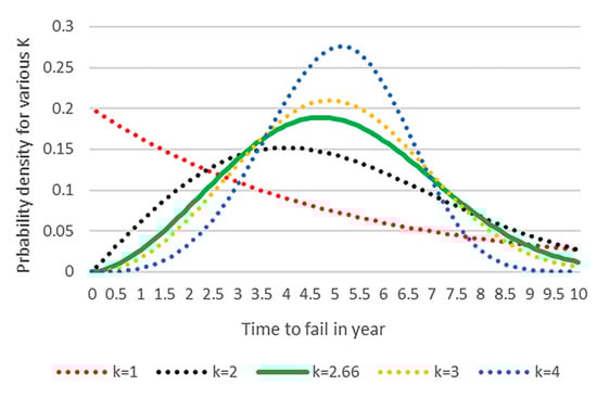 As mentioned earlier, the study uses Monte Carlo simulations [28] to consider the impact of inherently uncertain or stochastic variables on the model’s results. In the CM strategy, the primary stochastic variable modelled for each component is the length of time until a failure occurs (for a new component) or the time between failures (for a repaired component). For each iteration, the time to failure is modelled as a random selection from a Weibull distribution [45,46], where the parameters k and lambda (, respectively known as the shape and scale, are calculated based on the mean annual rate of failure and the reasonable assumption that there is a 1% probability that a component will fail before one fifth of its mean time between failures. This assumption is based on the behaviour of mechanical devices, where failure of a new component is less likely than failure of an older component due to wear and tear. The choice of the shape parameter produced by this assumption, shown in Figure 5 (solid green line), k = 2.66, is in line with the literature, for example [47]. This value for the shape parameter k may be found using Equations (1) and (2) [48] with the Weibull cumulative distribution function, CDF = 0.99, and the Weibull Mean Time Between Failure (MTBF) divided by five replacing x. The following pair of equations for k are solved numerically.