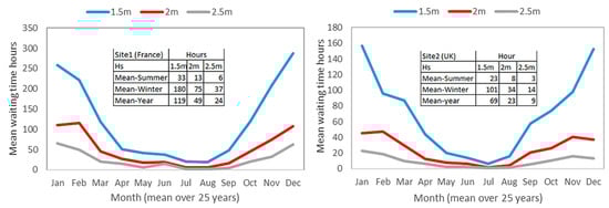 Weather windows are of particular importance to the O&M cost as they affect the availability of turbines due to waiting time for vessel operations at sea [26]. The current velocity and the weather, specifically wind speed, significant wave height, and wave period, can affect vessel operations, for example, lifting operations and vessel movements [49]. In this model, weather window waiting times are calculated by counting, for each hour of the project life-time, how long it will take until there will be a suitable continuous period for the vessel operations, during which the significant wave height (Hs) and wind speed are within the vessels’ limitations. Graphs illustrating the mean waiting times for Hs ≤ 1.5 m, Hs ≤ 2 m, and Hs ≤ 2.5 m (with wind speed ≤ 20 m/s in all cases) for the two locations and a 24 h weather window gap are shown in Figure 6.