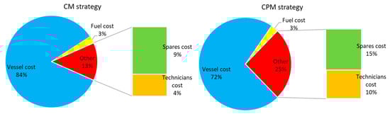 For the CM strategy scenario, the results show that the variable O&M cost of the tidal farm could be 77.3 €/MWh in Site1 (France) and 48.4 €/MWh in Site2 (UK). By considering a five-year-interval planned maintenance strategy, the O&M cost would reduce to 57.0 €/MWh in Site1 (France) and 36.5 €/MWh in Site2 (UK). This considerable reduction in the overall O&M cost for the CPM strategy is due to the 37% reduction in the turbines’ failure rates, which thus reduces the expenses associated with repairs, specifically the vessel costs. In the CPM strategy, the increased cost of spare parts (25%) and technicians (89%) is balanced with the decreased vessel costs (35%). Consistent with other studies, the vessel cost is the dominant component of the O&M cost (for examples, see [29,37]). The vessel cost in this study accounts for more than 84% of the variable O&M cost in the CM strategy and around 72% in the CPM strategy (see Figure 7).