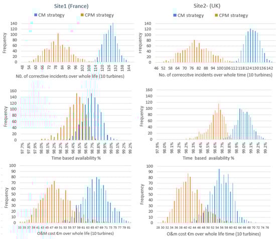 On average, the financial advantage of a CPM strategy over a CM strategy would be 16.3% in Site1 (France) and 7.5% in Site2 (UK). For both sites, the same number of hours are used for the preventative maintenance operations (i.e., 18.3 days for onshore maintenance tasks plus 1.7 days for transit and retrieval/reinstallation for each turbine), thus reducing the operational time (see the slight change in the time-based availability in Table 4). As a consequence of the preventative maintenance, the failure rates reduce at both sites by the same amount; however, since the weather window waiting time is longer at Site1 (France), there is a greater benefit in terms of operational time and financial advantage compared with Site2. This distinction between the two sites shows the importance of weather window waiting times for Offshore Renewable Energy (ORE) projects.