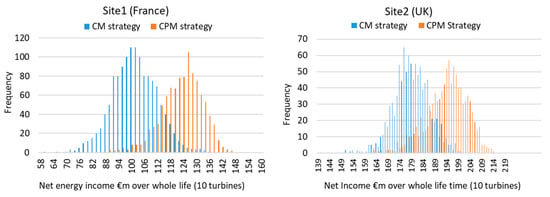 The histogram of net energy income (i.e., energy income minus O&M cost) in Figure 9 shows that for most of the simulations, the net energy income is higher for the CPM strategy. There is, however, some uncertainty with these types of outcomes as they depend on the random nature of failure events, and so there is an overlap between the worst outcomes of the CPM strategy and the best outcomes of the CM strategy. However, the expected average outcome for CPM is much better in terms of net income than for CM.