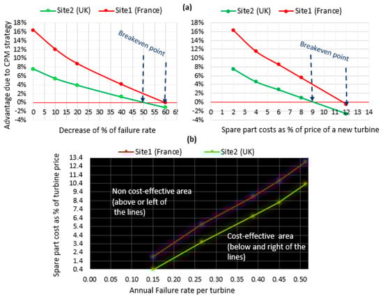 With respect to the number of failures, Figure 10a shows that the advantage of the CPM strategy is higher for the tidal farm in Site1 (France) compared to Site2 (UK). As mentioned earlier, a failure is typically more disruptive to power generation at Site1 than at Site2, and therefore the reduction of failure due to the CPM strategy has a more pronounced effect at Site1. As the failure rate reduces, there is less benefit from a planned maintenance strategy. The advantage will go to zero or become negative if the annual failure rate per turbine decreases by 50% or more (~0.26 failure/yr per turbine) in Site1 (France) and 60% or more (~0.15 failure/yr per turbine) in Site2 (UK). With respect to spare-part costs, Figure 10 shows that the advantage of the CPM strategy will go to zero or become negative if the spare-part cost is 10% or more (~€78,000 per turbine per year or 28 €/MWh) in Site1 (France) and 12% or more (~€97,000 per turbine per year or 17 €/MWh) in Site2 (UK). So, if failures are rare or if the spare-part costs for CPM are particularly expensive, then carrying out the CPM strategy may not be financially beneficial.