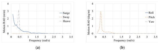 In Equation (1), is the significant wave height, is the peak frequency, is the peak period, and is the peak shape factor [40]. The coefficients used in the JONSWAP spectrum are presented in Equations (2)–(5), respectively. From the load RAO squared and the wave spectrum, the load spectrum can be obtained (see Equation (6)).