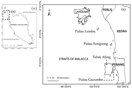 Map of Peninsular Malaysia (a) showing the sampling location in (b) region with the location of Pulau Lembu, Pulau Songsong, Teluk Aling, and Pulau Gazumbo.