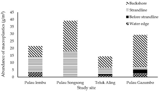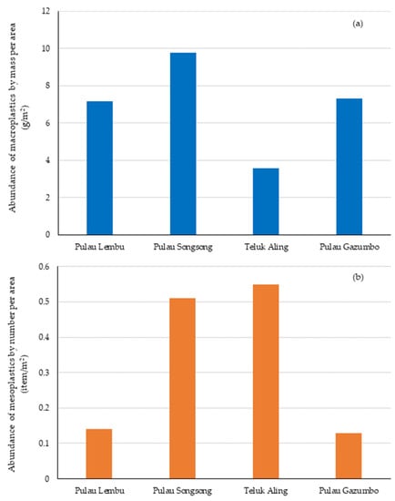 In terms of mass, most of the macroplastics (53–75% of total mass) were found at the backshore area, while in terms of number, most of the mesoplastics (52–80% of the total number) were also found at the backshore area, as shown in Figure 3 and Figure 4. The highest average abundance of total macroplastics by zone in terms of mass was found at Pulau Songsong, with 9.77 g/m2, followed by Pulau Gazumbo, with 7.32 g/m2, as shown in Figure 5. The lowest was found at Teluk Aling, with 3.58 g/m2. For mesoplastics, the highest was found at Teluk Aling, with 0.55 items/m2 in terms of number, followed by Pulau Songsong, with 0.51 items/m2, as shown in Figure 5. The lowest was found at Pulau Lembu and Pulau Gazumbo, with 0.14 items/m2 and 0.13 items/m2, respectively.