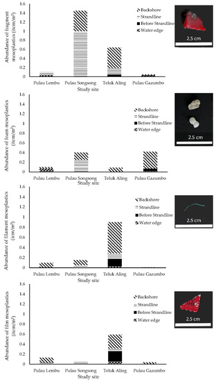 The abundance and distribution of different forms of mesoplastic debris collected from each transect zone of the study site by items/m2. An example of the form of mesoplastics is shown on the right side of the corresponding graph.