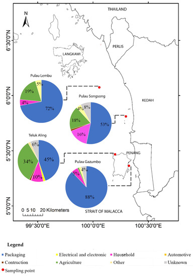 Agricultural debris, such as buoys and fragments of net, ropes, and lines, could originate from the fishing activities surrounding the beach, especially at Teluk Aling. Similar to other beaches in Malaysia, such as Penarak Beach, Kedah, Sibu Island, Johor and Pasir Panjang Beach, Negeri Sembilan, that have fishing activities, fishing-related debris was spotted [30,60].