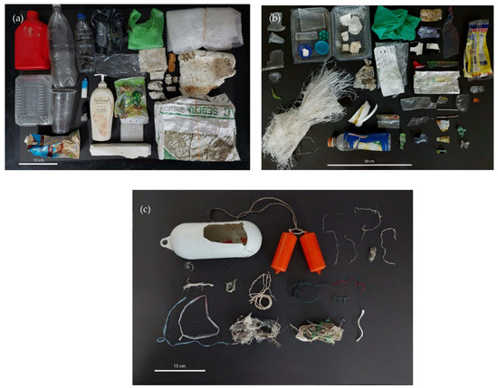 The collected samples were washed with freshwater to remove sediment and natural debris not associated with the plastics. The samples were then air dried, and identification was given for, for example, plastic bottles, plastic cups, plastic bags, rubber, toys, cable ties, plastic straws, ropes, and other debris that was found and could be identified. The debris was photographed. Debris in which we were unsure of whether it was plastic was tested with a hot needle test based on De Witte et al. (2014) [35]. A small fragment of the object was cut out and placed under a stereomicroscope with appropriate magnification to observe any changes in the object. A needle was contacted with a flame until it was red or orange in colour, and then it was quickly contacted with the object. A melting or curling event on the object was noted, which indicated the possibility of plastic material.