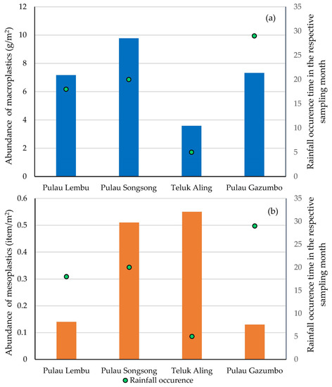 In addition, rainfall may influence the deposition of macroplastics at the current study sites, as in Teluk Aling, the rainfall occurrence time was lower than the other sites, which could be one of the factors for the lower abundance of plastic debris than other study sites besides the management of the beach and human activities. However, this was inconclusive, as this preliminary study did not consider the influence of seasonal variation on the study sites. Rainfall could cause debris runoff from the land through rivers and enter the marine environment [65]. Similar to the study of [66], on the east and west coasts of Hong Kong, the abundance of plastic debris was higher during the wet season, which was accompanied by higher rainfall than in the dry season. However, the east coasts of Hong Kong were not influenced by the different seasons due to their further distance from the Pearl River estuary. This may apply to current study sites, where the season and rainfall might not influence certain locations. Nevertheless, more comprehensive studies are needed to confirm the seasonal variation in the abundance of plastic debris at the study sites. Other variations that might influence the deposition of debris at the beach during the different monsoon seasons could be wind exposure and water current. Besides, other factors, such as the rate of embrittlement and fragmentation of macroplastics, could also influence the number of mesoplastics at the study sites.