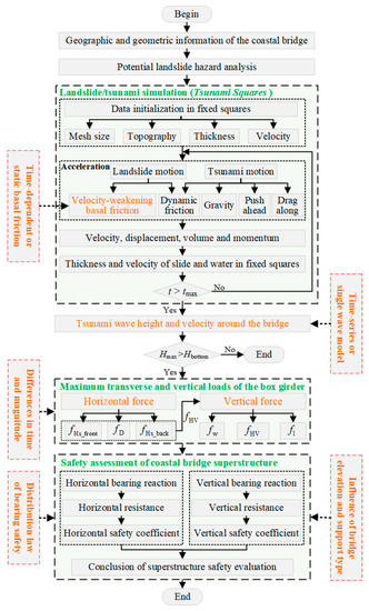 To evaluate the safety of the box-girder superstructure under the potential landslide tsunami waves, we established an analytical framework as shown in Figure 1. First, we analyze and identify landslides that may pose a threat to a bridge superstructure based on the geographical location of the bridge. Second, we update the Tsunami Squares (TS) method by introducing velocity-weakening basal friction to optimize the simulation of landslides and tsunamis and obtain a more reasonable tsunami wave height and velocity around the bridge. Third, the force of a wave, if tsunami waves impact the box girder, can be calculated using the summarized empirical algorithms. Finally, we establish a finite element model of the coastal bridge and compute the reaction of the bearing under tsunami waves. After a comprehensive comparison of the support’s horizontal and vertical security redundancy, the safety assessment conclusions of the box girder can be determined based on whether vertical disengagement or lateral displacement occurs.