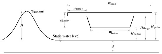 where α is the inclination coefficient and α = 1 − tanφ, where φ is the angle between the girder web and the vertical direction. and are the effective coefficients of the girder width and deck thickness, which are all conservatively set equal to 1.0. ρ is the density of the water. is the acceleration of gravity. As seen in Figure 2, H is the tsunami wave height. and are the distance from the static water level (SWL) to the bottom of the girder and flange. d is the water depth. is the height of the girder. is the distance from the SWL to the top of the box girder. is the width of the girder. is the width of the flange plate. represents the width at the bottom of the girder. and are the drag and lift force coefficients, respectively, which are both equal to 1.0. is the impact coefficient corresponding to a wave breaking. Here, we do not consider the impulse forces caused by a wave breaking, and . represents the maximum lateral velocity of water at the center position of the girder. is the maximum vertical velocity of water at the bottom of the girder. The fluid is simplified to a two-dimensional model without considering the height direction in the TS method. Here, takes the velocity of the fluid square and is the variation of the water surface elevation in unit time.
