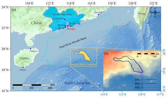 The Baiyun Slide Complex (BSC), a large-scale study of a slope collapse, is located in the middle and lower landscape region of the Pearl River Mouth Basin (Figure 3). The BSC covers an area of ~5500 km2 and has a maximum length of 200 km. The water depth is 1100–3100 m, and the average slope is ~0.65° [49]. Based on high-quality seismic reflections and multi-beam bathymetry data, Li et al. [50] pointed out that the BSC is a hotspot for mass movement due to the excess pore pressure aided by volcanic activity, tectonic overstepping, and gas hydrate dissociation. Additionally, Sun et al. [51] suggested that the lateral migration of free gas is likely to trigger a multi-stage slope failure. However, whether such a massive landslide occurred in a single significant incident or multiple incidents is still controversial. Wang et al. [52] divided it into four regions utilizing the maximum likelihood classification. Li et al. [50] identified a conceptual four-phase model analyzing its sedimentary and seismic characteristics. After studying a large amount of seismic data and multi-beam bathymetrical data, Sun et al. [53] proposed six events of Mass Transport Deposits (MTDa–MTDd, MTDo1, and MTDo2) and supplied detailed information on their age, volume, geographical area, and thickness.