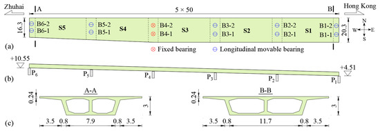 As shown in Figure 3 and Figure 4, a continuous box girder bridge with five spans (5 × 50 m) in southeast China is selected for safety assessment. A box girder with a twin chamber gradually narrows from 20.3 m to 16.3 m in width. The height of the box girder is 3.0 m, and the flange plate is 0.24 m high and 3.5 m wide. Figure 4c displays the structural details of the two cross sections. The bottom elevation of the girder gradually climbs from 4.51 m to 10.55 m. Above each pier (P1–P6), there are two identical hyperbolic spherical bearings, including fixed and longitudinally moveable bearings. All bearings do not provide vertical tension, and the horizontal ultimate bearing capacity of B1-1–B6-1 is 1250, 2000, 2000, 2000, 1750, and 1000 kN.