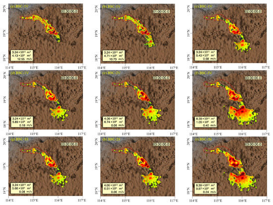 The landslide magnitude and dynamics have a significant impact on tsunami generation. Figure 5a–d show the snapshots of BSC-1 with velocity-weakening basal friction (BSC-1V) at 30 min, 1 h, 2 h, and 3 h. The soil slips from northwest to southeast and finally forms a fan deposit in the southeast. For the BSC-1 with the static basal friction model (BSC-1S, Figure 5g), the last deposit and average velocity for three hours are slightly smaller than those of BSC-1V. The snapshots of BSC-2 and BSC-3 in Figure 5e,f,h,i show a similar law to BSC-1. Figure 6 shows that the coverage area and average velocity considering the velocity-weakening basal friction model are always greater than the static basal friction model, and the difference in coverage area gradually increases over time. Close to 3 h under all conditions, the coverage area and average velocity have tended to be a stable value, and the maximum average speed is only 0.40 m/s. Therefore, the total duration of landslide simulation is 3 h, ensuring that most of the energy of the soil is transferred to the water.