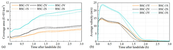 Parameter of landslide motions (BSC-1–BSC-3): (a) Coverage area; (b) Average velocity.